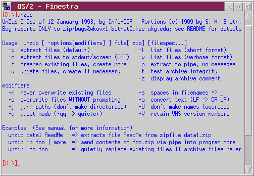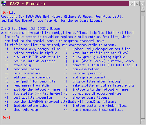 ZIP 2.0.1 ed UNZIP 5.12 sono rispettivamente un compressore ed un decompressore di file compatibili con la coppia PKZIP/PKUNZIP 2.04g della PKWare, nativi per OS/2 e totalmente gratuiti (ne esistono i porting anche per altri sistemi operativi come Unix, Minix, Windows NT, Amiga); la linea comandi ha una impostazione leggermente diversa rispetto a quella dei corrispettivi programmi PKWare ma tutto sommato è solo questione di abitudine, basta usarli poche volte per acquisire subito la necessaria scioltezza.