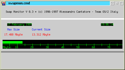 Un ulteriore discorso meritano i parametri m e n. In particolare il parametro n (dimensione iniziale del file di swap), per migliorare le prestazioni, va settato alla massima dimensione raggiunta dal file di swap durante un normale uso del sistema. Per determinare tale dimensione è sufficiente un semplice script REXX, SWAPMON.CMD allegato con questo numero di "Just WARP!", che monitorizza la dimensione del file di swap registrando nel file SWAPMON.LOG la dimensione massima raggiunta.