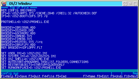 PROTSHELL=H:\OS2\PMSHELL.EXE che serve a inizializzare Presentation Manager, ovvero l'interfaccia grafica di OS/2; mettendo al suo posto =H:\OS2\CMD.EXE si ottiene di partire a tutto schermo con la sola finestra comandi di OS/2 potendo così eseguire solo applicativi a pieno schermo e non grafici (ovvero quello che succede quando si parte con [Alt][F1] e poi [F2] come spiegato prima).