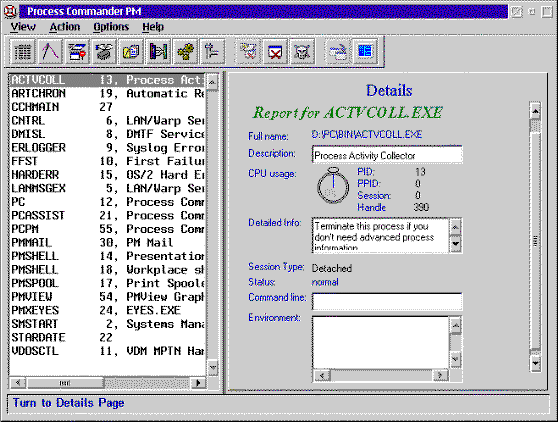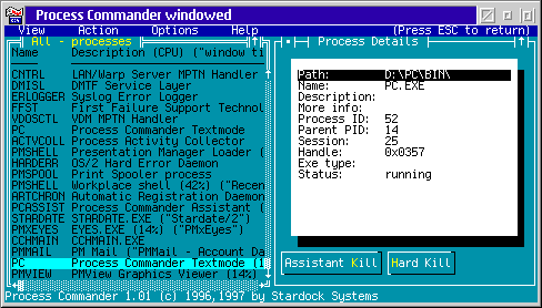 Insieme al PC Full Screen troviamo anche Process Commander PM, che offre alcune delle funzionalità presenti nel "fratello" in modalità testo combinate con una gradevole interfaccia grafica PM. Per sua stessa natura PC PM non può però essere utilizzato per risolvere i crash della WPS (ovviamente, se la WPS è bloccata PC PM non potrà neanche essere lanciato!); il suo scopo è invece quello di fornire dettagliate informazioni sullo stato del sistema mentre stiamo lavorando con OS/2.