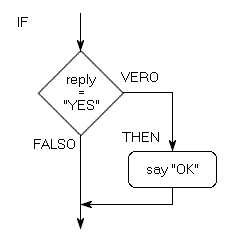 ![]() L'espressione di decisione è rappresentata dal rombo. Se l'espressione (reply = "YES") è vera, il flusso di esecuzione del programma prende una deviazione per un ulteriore istruzione (say "OK!") prima di riprendere il flusso normale.