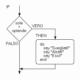 Diramazione semplice if espressione then istruzioneL'istruzione viene eseguita solo se l'espressione è vera. Per esempio: /* richiesta di conferma */ say " digita YES per continuare" pull reply if reply = "YES" then say "OK!"L'istruzione say "OK!" viene eseguita solo se nella variabile reply è memorizzato il valore "YES". L'istruzione IF introduce una nuova branca di istruzioni da eseguire se l'espressione che segue IF è vera. I programmatori spesso visualizzano l'azione di decisione di quale branca di istruzioni tramite un diagramma chiamato diagramma di flusso.
