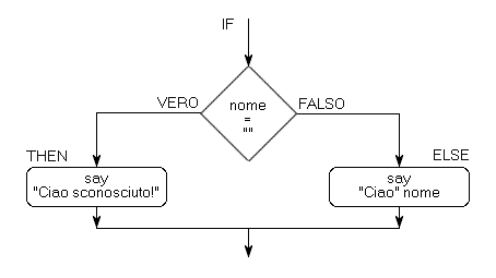 La parola chiave ELSE IF espressione THEN istruzione 1 ELSE istruzione 2Quando IF è usato in questo modo il REXX esegue solo una delle due istruzioni: istruzione 1 se espressione è VERA, istruzione 2 se invece è FALSA. Anche nel primo esempio di questo corso si era usato IF...THEN...ELSE: /* CIAO.CMD : questo è il mio primo programma REXX */ say "Ciao! Come ti chiami?" pull nome if nome = "" then say "Ciao sconosciuto!" else say "Ciao" nomeIl diagramma di flusso è il seguente: