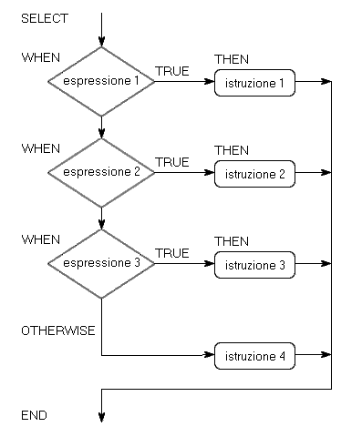 e l'elaborazione poi prosegue con le istruzioni che seguono END.Se espressione1 è FALSA viene controllata la validità di espressione2: se questa è VERA viene eseguita istruzione2 e l'elaborazione riprende con l'istruzione successiva a END, altrimenti vengono testate le rimanenti espressioni finché non se ne trovi una VERA. Nel caso nessuna espressione risulti VERA viene eseguito il blocco di istruzioni compreso tra OTHERWISE (che in italiano significa altrimenti) e END. Il diagramma di flusso per l'istruzione SELECT è il seguente: