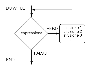 Il ciclo DO WHILE DO WHILE espressione istruzione1 istruzione2 istruzione3 . . . ENDdove espressione deve dare come risultato 0 (FALSO) o 1 (VERO). Come si vede dal sottostante diagramma di flusso, la condizione viene testata all'inizio del ciclo, prima dell'esecuzione della lista di istruzioni. Ciò implica che se la condizione non viene soddisfatta nella fase iniziale la lista di istruzioni non viene mai eseguita. Al contrario nel ciclo DO UNTIL la condizione viene verificata solo a fine ciclo, perciò, anche nel caso che non venga sodisfatta dall'inizio, la lista di istruzioni viene eseguita almeno una volta.