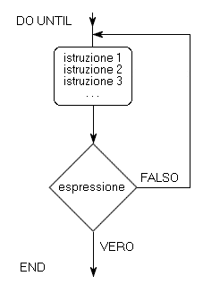 Il ciclo DO UNTIL DO UNTIL espressione istruzione1 istruzione2 istruzione3 . . . ENDdove espressione quando viene valutata dall'interprete del REXX deve dare come risultato o 0 o 1. La condizione viene verificata solo a fine ciclo, cioè dopo ogni volta che la lista di istruzioni viene eseguita. Ciò implica che la lista di istruzioni viene eseguita anche se espressione è VERA dall'inizio. Paragonate il seguente diagramma di flusso con quello del ciclo DO WHILE: