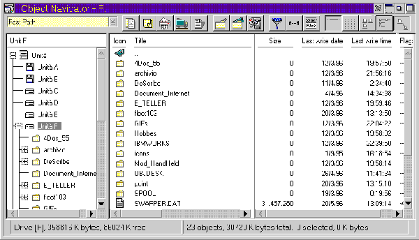 Con Object Navigator potete girovagare per i vostri hard disk, copiare o spostare files, creare copie collegate, cambiare gli attributi dei files e molto altro ancora. Una feature purtroppo assente e di cui si sente la mancanza è la possibilità di ottenere la lunghezza dei files contenuti in una directory.