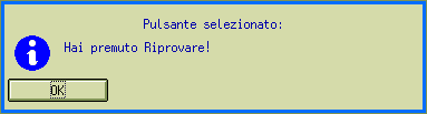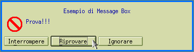 PMREXX D:\TEST\MSGBOX.CMD ABORTRETRYIGNORE HAND Esempio di Message BoxPremendo su uno dei tasti visualizzati nella Message Box, apparirà una nuova Message Box in cui viene riportato il tipo di tasto premuto.