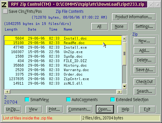 Scelto il file da scompattare, ne viene prima testata l'integrità, poi viene mostrato un eventuale commento ed infine, in una list box, l'elenco dei file contenuti.
