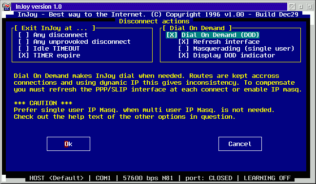 E' da notare che il Dial on Demand NON funziona finché non ci si è connessi con successo una volta al proprio ISP, perché Injoy deve prendere delle informazioni di instrdamento perché il DOD funzioni.