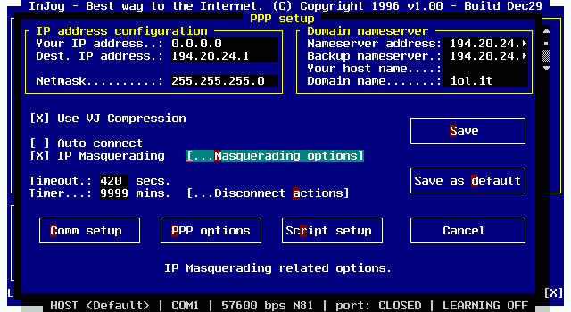 Per usare queste due funzioni è necessario registrare InJoy, avere l'IP masquerading per 4 stazioni costa 35 dollari, per 150 dollari il numero è illimitato e si ha anche un server PPP e uno SLIP; in entrambi i casi la registrazione è a vita.