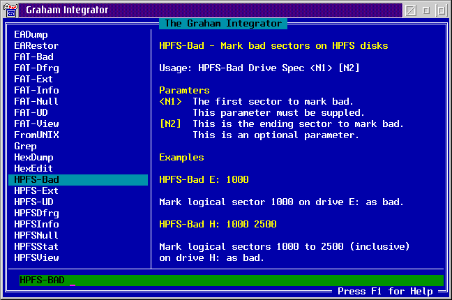 Alla mancanza di una comoda interfaccia e alla necessità di usare gli switch a riga di comando si può comunque porre rimedio utilizzando il Graham Integrator (GI per gli amici) che permette di richiamare le altre utilità e al contempo fornisce un riepilogo sulle singole opzioni del programma selezionato. Per ciascun programma, inoltre, è disponibile un breve aiuto da linea di comando; per i programmi interattivi, invece, si può accedere all'aiuto tramite hotkey (la sempre valida F1).