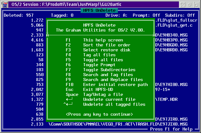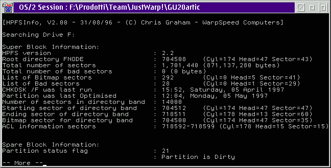 [F:\Prodotti\Team\JustWarp!\gu20artic]hpfs-ext [HPFS-Ext, V2.00 - 31/08/96 - (C) Chris Graham - WarpSpeed Computers] Press ESC to abort at next file. Searching Drive F: F:\Prodotti\Team\JustWarp!\gu20artic\folder4.gif Comprises 2 extents. F:\Prodotti\Team\JustWarp!\gu20artic\gi.gif Comprises 1 extent. F:\Prodotti\Team\JustWarp!\gu20artic\gu-box.gif Comprises 1 extent. F:\Prodotti\Team\JustWarp!\gu20artic\GU20artic.htm Comprises 4 extents. [F:\Prodotti\Team\JustWarp!\gu20artic]Con il programma HPFSDfrg (oppure FAT-Dfrg) si riduce la frammentazione di singoli files: