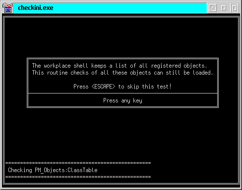 CHECKINI.EXE controlla l'integrità dei file INI permettendo di eliminare tutti i riferimenti agli oggetti non più presenti sul disco, la deregistrazione di classi e altre operazioni utili per risolvere tanti strani problemi dovuti alla corruzione dei file INI. Anche nel caso non ci sia alcun problema, la regolare pulizia dei file di inizializzazione comporta sempre un miglioramento più o meno evidente in tutte le operazioni effettuate tramite la Workplace Shell (cioè l'interfaccia grafica) di OS/2.