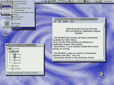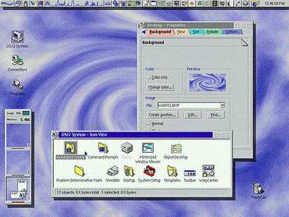 OS/2 Warp 4 introduce un nuovo look'n'feel in 3d, con icone tridimensionali a 256 colori ed ombreggiate e temi grafici che aumentano la profondità della scrivania. Le cartelle sono state ridisegnate ed è possibile personalizzarne i colori. le funzioni multimediali sono integrate, permettendo di ascoltare file audio, visualizzare filmati (anche MPEG) e immagini direttamente dalle icone che li rappresentano. Qui sotto un' immagine della nuova scrivania con alcuni ritocchi operati da Object Desktop della S rdock.